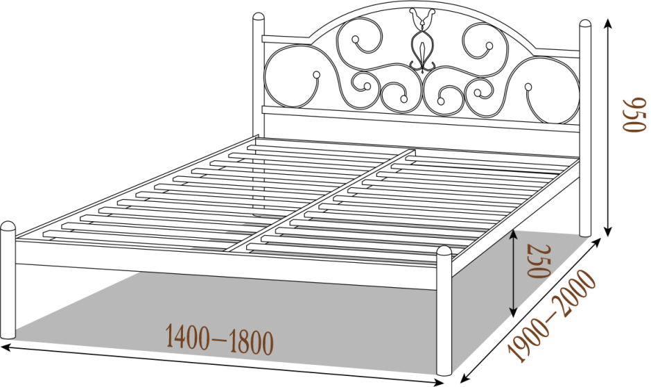 Общая ширина = ширина спального места + 60 мм Общая длина = длина спального места + 60 мм Высота изголовья – 950 мм Высота спального места от пола (с матрасом 20 см ) – 500 мм