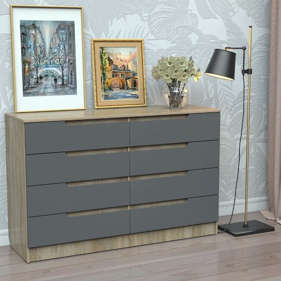 Цвет комода - 1. Аляска 2. Дуб шервуд 3. Дуб клондайк 4. Дуб Тахо 5. Дуб фрегат 6. Дуб молочный 7. Дуб сонома 8. Дуб сонома трюфель 9. Бук светлый 10. Ольха темная 11. Яблоня локарно 12. Орех лесной 13. Орех темный 14. Венге 15. Черный 16. Ваниль 17. Графит 18. Серый 19. Индастрил 20. Белый матовый 21. Светло - голубой 22. Оранж 23. Желтый 24. Красный