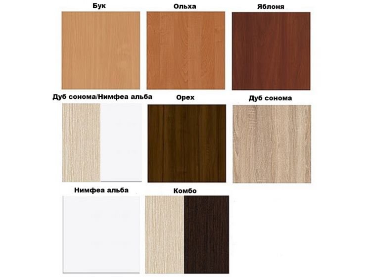 Колір стінки-1. Бук 2. Вільха 3. Яблуня 4. Дуб сонома/німфеа Альба 5. Горіх 6. Дуб сонома 7. Німфеа Альба 8. Венге світлий/венге темний