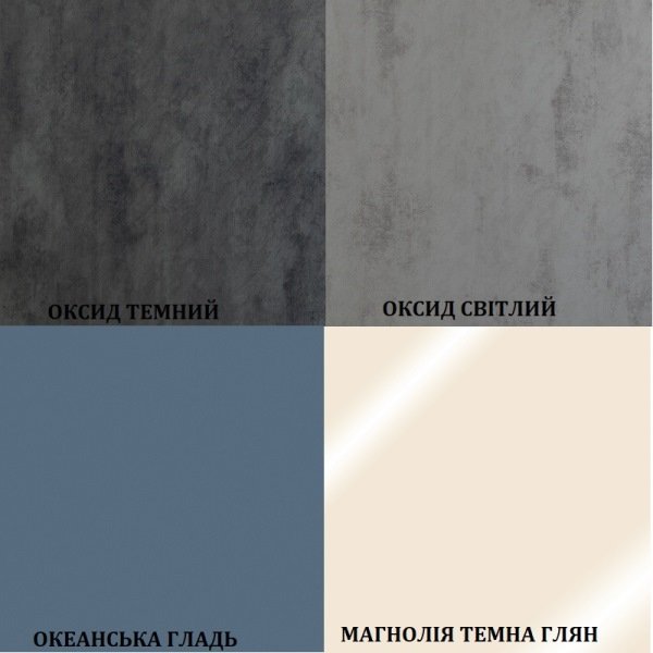 Колір фасаду - 1. чорний глянець 2. білий глянець 3. капучіно глянець 4. сілк нефріт 5. сірий граніт глянець 6. секвоя 7. роял артвуд 8. попелястий металік 9. горіх шоколадний 10. оксид темний 11. оксид світлий 12. океанська гладь 13. магнолія темна глянець 14. крафт бронза 15. сосна прованс 16. дуб світлий 17. акація 18. галактика біла 19. венге південий 20. чорний матовий 21. білий матовий
